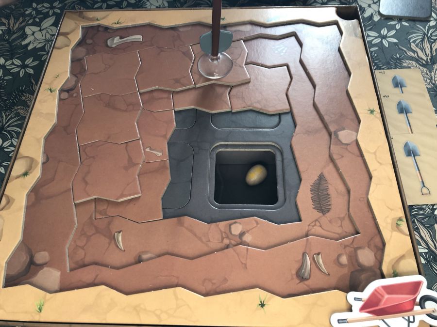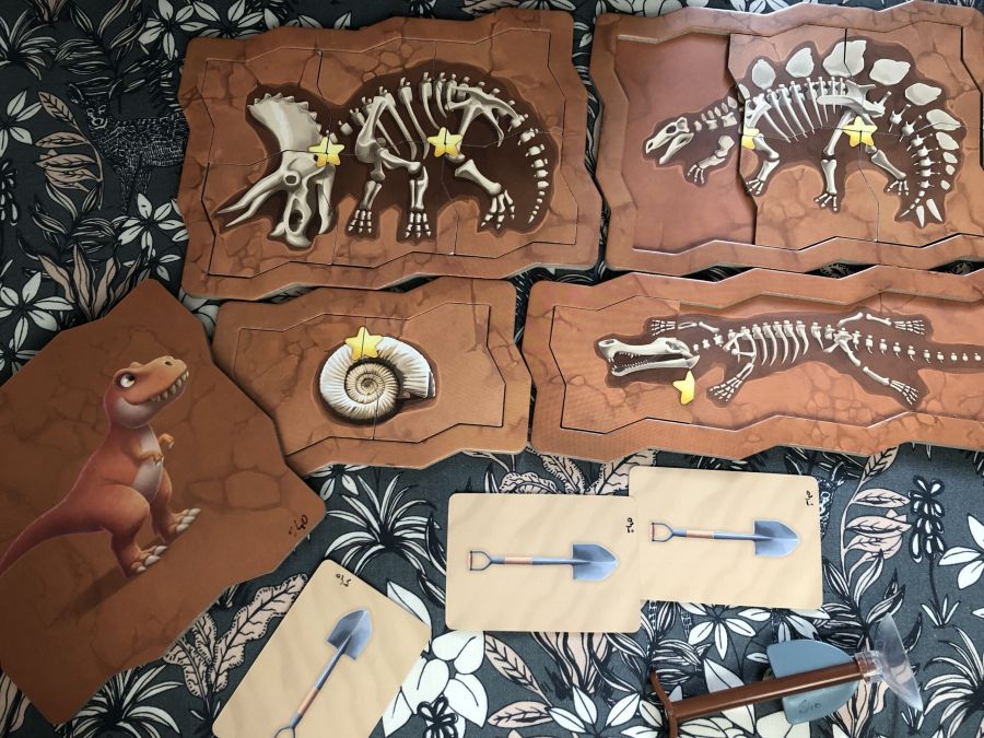 L’équipe dispose de 11 pelles (cela varie selon le nombre de joueurs) représentées par des cartes et d’une brouette par joueur. Chaque fois qu’un joueur creuse grâce à la pelle ventouse, on retire une tuile du plateau, construit sur 4 étages. Nous avons alors 5 possibilités. Vous tombez sur un (ou des) cailloux. Cela a pour conséquence de casser autant de pelles de votre inventaire. Si l’on casse la dernière, la partie s’arrête immédiatement. Deuxième possibilité, on découvre 1 (ou 2) marteau(x). C’est une bonne nouvelle puisque ces derniers permettent de réparer autant de pelles que de marteaux. Troisième possibilité, une loupe. Cette tuile permet de regarder une autre tuile (pas encore fouillée) afin de prévenir tout le monde de ce qu’il y a dessus. Quatrième option, une brouette. Elles servent à évacuer une tuile contenant des cailloux afin de ne pas casser de pelles. Parfait quand on retourne une tuile avec 4 ou 5 cailloux. Et enfin, des os de dinosaures, qu’il faudra collectionner afin de reconstituer des étoiles qui servent à définir votre score en fin de partie.