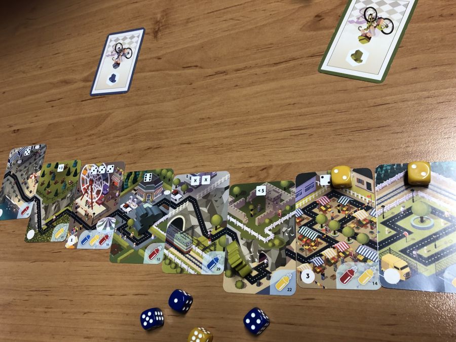 Le parcours est constitué de cartes. Pour les traverser, il suffit de remplir la condition marquée sur celles-ci. Et comme son nom l’indique, dicycle est un jeu de vélo mais aussi de dés. Les conditions sont donc par exemple un 5 rouge, un score inférieur à 3 jaune, une paire de deux jaune et bleue…