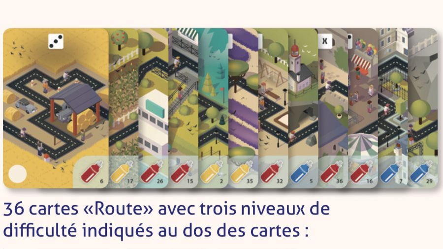 Pour la durée, il faut compter 20min par partie. C’est variable selon la difficulté choisie et la longueur du tracé. Car oui, vous pouvez très bien raccourcir le tracé pour un petit sprint en vitesse. On peut aussi s’amuser à faire des tracés longs avec des embranchements (pourquoi pas un côté plus long et plus facile et un raccourci plus dur) ajoutant encore un peu de stratégie.