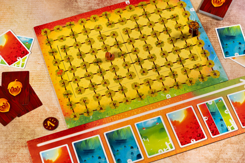 Le jeu est aussi simple d’installation qu’il est mignon. On pose le plateau en 2 parties de manière aléatoire pour former un ensemble de branches à traverser avec notre écureuil pour le ramener à la maison.