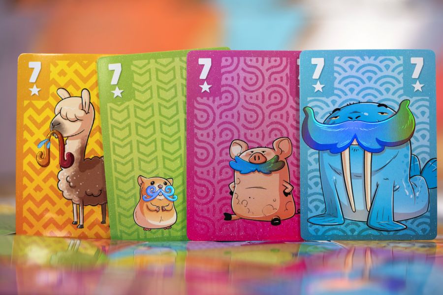 Jouable de 3 à 6, Moustache c’est du jeu fun, drôle et chaotique comme j’aime. Le genre de jeu qu’il ne faut pas prendre au sérieux. Ici, vous êtes là pour vous marrer et essayer de mettre des stratégies foireuses en place. Foireuses car certainement pourries par votre coéquipier ou coéquipière. Ca râle, ça chambre et ça rigole. On rigole en jeu mais également en voyant les géniales illustrations de Gorobeï. Ses animaux « kawaiis chelous » avec leurs moustaches qui grandissent en fonction de leur valeur font leur petit effet. Le matériel, de son coté, vous fera sûrement lâcher un « wahou » ! Les cartes sont très qualitatives et surtout, SURTOUT, il y a un effet brillant (les pros qui se la pètent disent « foil ») sur les moustaches des bestioles ! Il y a même des cartes spéciales brillantes super jolies utilisées pour jouer en nombre impair. D’ailleurs, même si cela fonctionne très bien, je vous conseille fortement de jouer à quatre ou six. Jouer à deux ou trois binômes c’est quand même bien plus sympa.