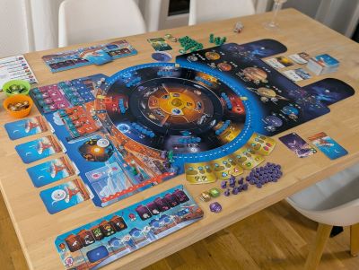 En plus d’être plutôt long et complexe, le jeu est également destiné à celles et ceux qui disposent d’une grande table. Car si le plateau est plutôt joli, avec un système de rotation du système solaire aussi amusant à manipuler qu’intéressant et intelligent à jouer, il est très largement surdimensionné ; ce qui rend son utilisation sur une table modeste assez compliquée. De plus, SETI fait partie de ces jeux qui nécessite un laps de temps relativement conséquent dédié à la mise en place, entre le plateau principal en trois parties, le soleil et le système de rotation à installer, les deux plateaux aliens, les données et les technologies à disposer, etc. Rien que pour ça, il faut être motivé pour y jouer.