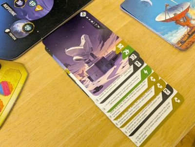 - Jouer une carte : Jouer une carte depuis sa main en payant son coût (généralement 1 à 4 crédits, mais parfois aussi de l’énergie), afin de gagner son effet. Certaines cartes sont des missions que vous pourrez accomplir en cours de partie et d’autres vous permettront de remporter des points de victoire supplémentaires à la fin.