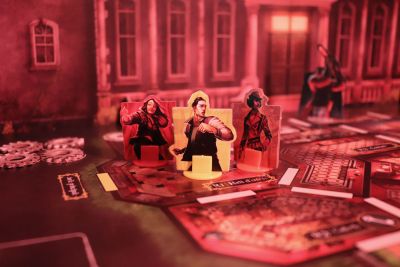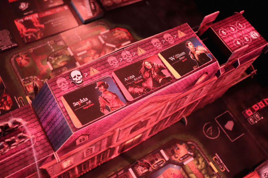 Ce qui frappe en premier, lorsque l’on s’installe à la table, c’est ce manoir tout en 3D faisant office de paravent, de tour à dés et incluant diverses pistes. Le matériel est complètement dingue. Et ce n’est pas du « bling bling » j’en fais des caisses parce que je suis un projet Kickstarter. Tout a une vraie utilité. Tout est bien pensé. Du matériel de très bonne qualité. Typiquement le genre de matériel qui peut faire peur au premier abord car, bien souvent, associé à des règles lourdes et complexes. Et pourtant, ici, ce n’est absolument pas le cas. Les règles sont simples, claires et limpides. Les tours s’enchaînent assez vite et il n’y a pas de temps morts.