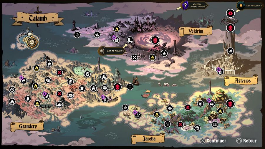 La progression est assez lente et il vous faudra mourir un certain nombre de fois avant d’espérer découvrir les 4 zones de jeu et surtout atteindre le boss final. Le cheminement est à choisir à chaque run et apporte donc une variété notable entre les différentes parties. On croisera des niveaux remplis d’ennemis, des camps pour se reposer, des auberges, des boss et des passages secrets un peu partout.