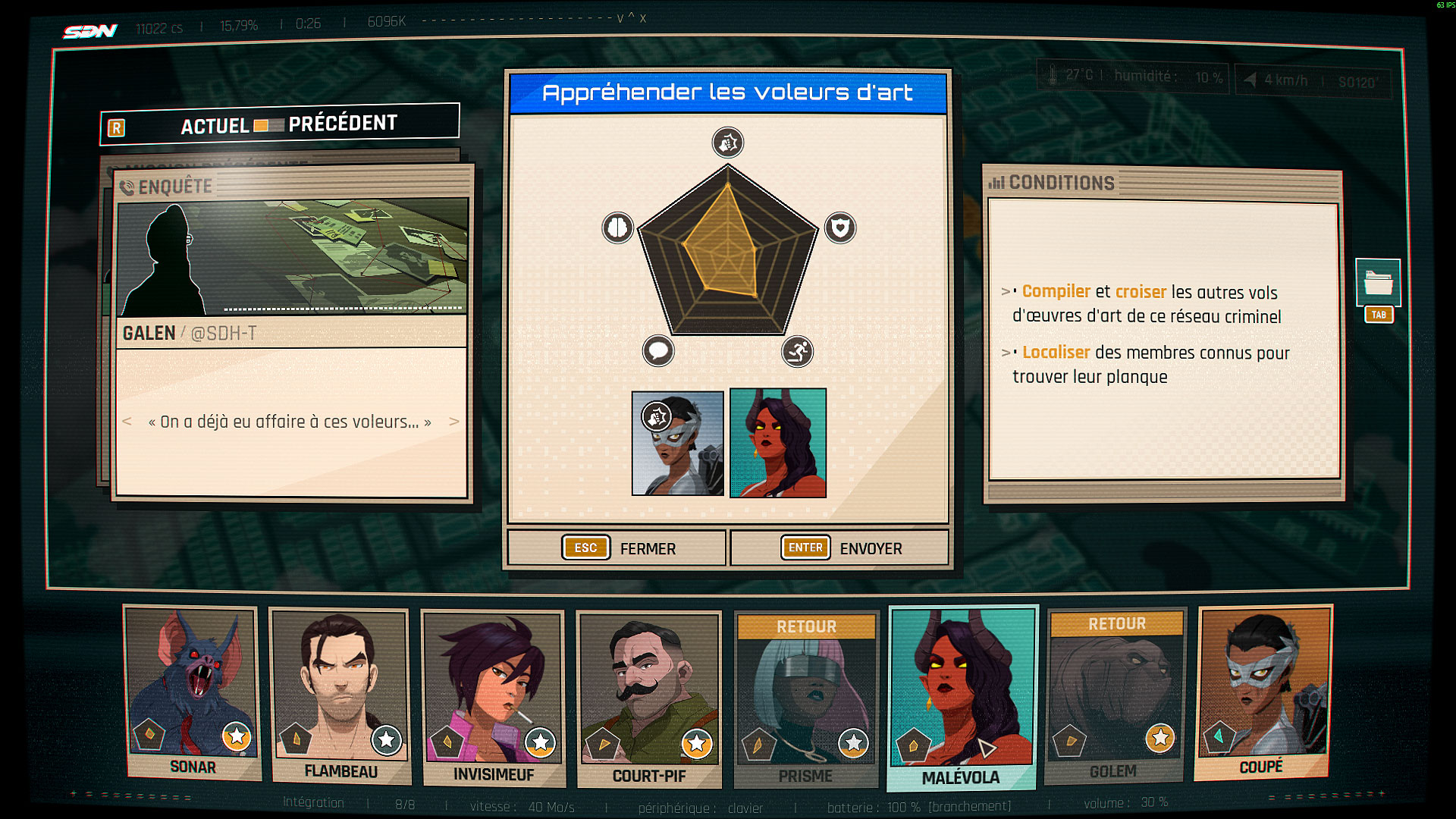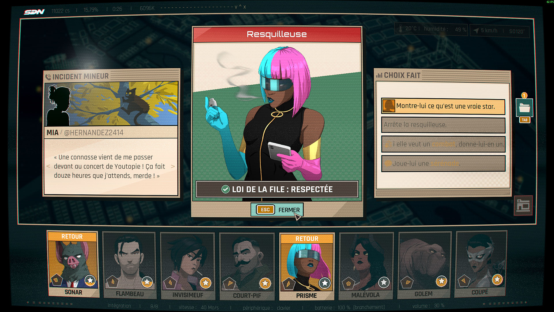 Ce mini-jeu est loin d’être simple et nécessite de prendre les meilleures décisions le plus rapidement possible, sachant qu’il n’existe jamais de candidat idéal et que vous pouvez tout de même foirer une mission avec 86% de taux de réussite (ou inversement, réussir une mission avec 12% de chances). Pour vous aider, outre les profils et les compétences des différents agents, vous disposerez de trois items à usage unique qui vous permettront de soigner ou reposer immédiatement un héros. Chaque chapitre va proposer deux demie journées de dispatch et à chacune de ces sessions, vous ne bénéficierez que d’un item de chaque (et encore, les deux derniers se débloquent plus tardivement). Il vaut mieux éviter des les utiliser à tort et à travers, mais ce n’est pas non plus très malin de terminer une session avec un item inutilisé. Enfin, de temps en temps il sera proposé à Robert d’intervenir directement, en piratant des systèmes informatiques, soit depuis la map d’intervention, soit pendant les séquences narratives. Là encore, si les premiers piratages s’avèrent extrêmement simple, ça se complique considérablement par la suite, et notamment lorsqu’il s’agit d’événements facultatifs. Notez qu’au clavier, la gestion de l’AZERTY n’est pas supportée pour le ZQSD, il sera donc nécessaire de jouer au pad ou de passer votre clavier en QWERTY (Windows + Space, pour les profanes). J’entends d’ici Toma et Smy railler la complexité du PC…