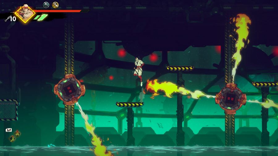 L’autre moitié du jeu consiste en un jeu de plateforme qui devient de plus en plus dur en avançant. Si au début on a l’impression de retrouver le Shinobi de la master system, très vite les environnements vont se complexifier et les plateformes vont devenir de plus en plus difficiles d’accès. Il faudra jouer de sauts, double sauts, dash au sol ou en l’air ainsi que du grappin ou des rebonds sur les murs pour parvenir à traverser des zones semées d’embûches et de pièges mortels.