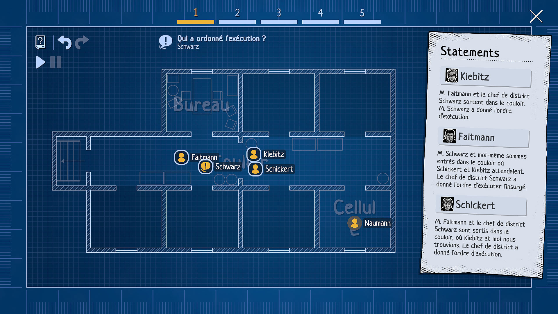 Votre première enquête est celle d’un homme âgé retrouvé mort dans la forêt, abattu froidement d’une balle dans la tête après avoir été enlevé par des agents du NSPD pour interrogatoire. D’après les conclusions de la première enquête, il aurait été exécuté pour trahison selon les règles dictées par la loi de l’époque, mais sa veuve est persuadée du contraire et fait appel à vous pour faire toute la lumière sur cette affaire. Celle-ci va tourner autour de trois axes distincts : L’analyse de photo et documents pour commencer, car ce sont eux qui vont vous permettre de prouver vos allégations. L’audition des témoins, au moyens d’une séquence de reconstitution sous forme de flashback. Et enfin le procès des principaux accusés, où il vous sera demandé d’exposer votre théorie et d’apporter les preuves afin de l’appuyer.